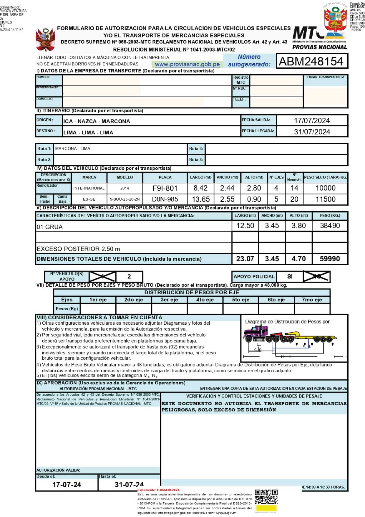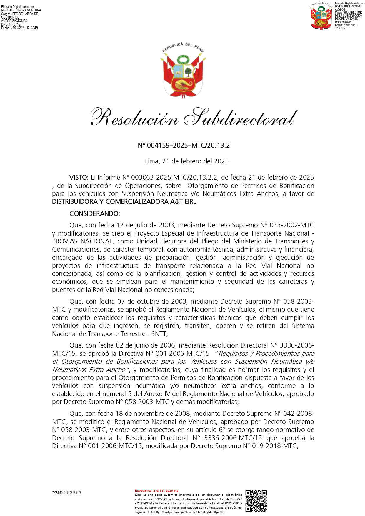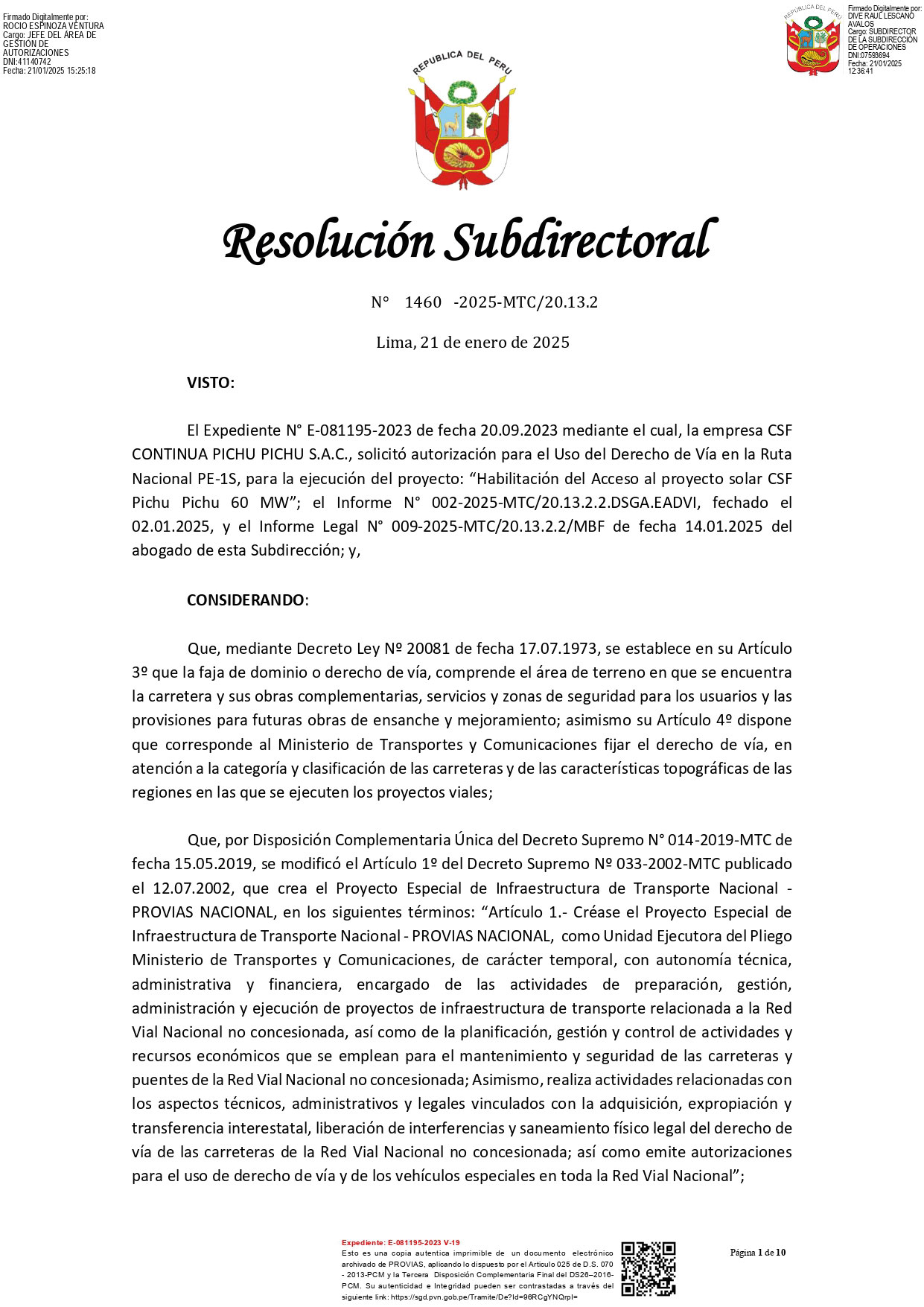 Es el acto administrativo emitido por el Ministerio de Transportes y Comunicaciones, mediante Provias Nacional, para autorizar la ejecución de trabajos proyectados dentro del derecho de vía de las carreteras que forman parte de la Red Vial Nacional.